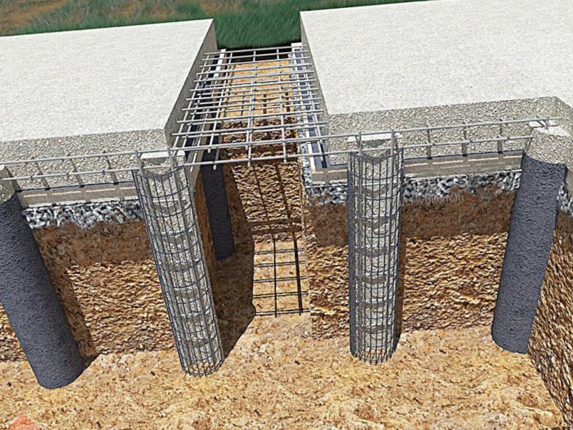 - Фундамент свайно-ростверковый — комбинация свай и железобетонной ленты, обходится дешевле традиционного ленточного фундамента и хорош для склонов и неустойчивой почвы.