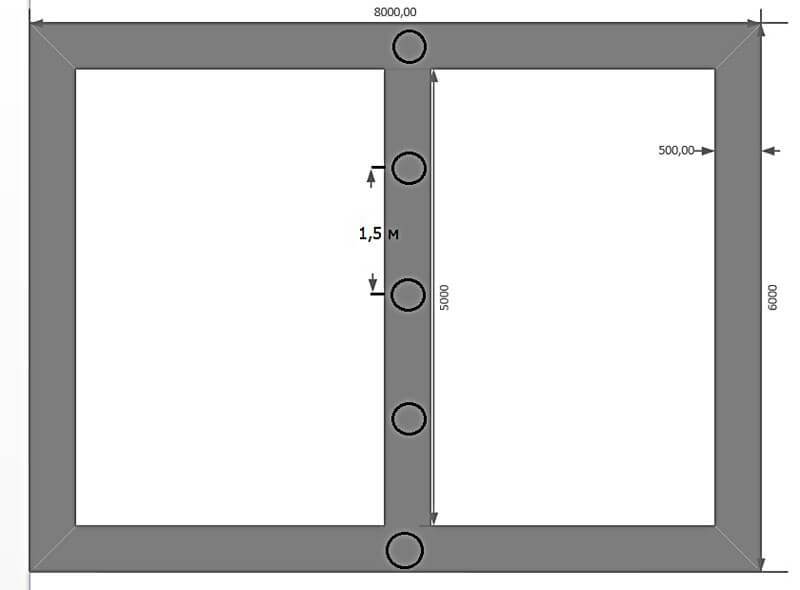 Для фундамента размером 6 на 8 нам нужно вычислить периметр основания и добавить к нему длину несущих стен, под которыми также будет заложен фундамент. В нашем случае периметр будет равен: