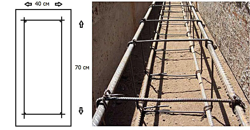 В нашем случае, для поперечной и вертикальной арматуры при высоте фундамента 80 см, можно использовать гладкие стержни диаметром 6 мм. Однако, если вы строите, например, двухэтажный коттедж, то для поперечной и вертикальной арматуры подойдут стержни диаметром 8 мм.