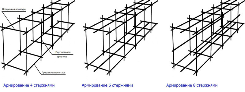 Для более широких фундаментов лучше всего подойдет схема армирования с 6-8 стержнями.
