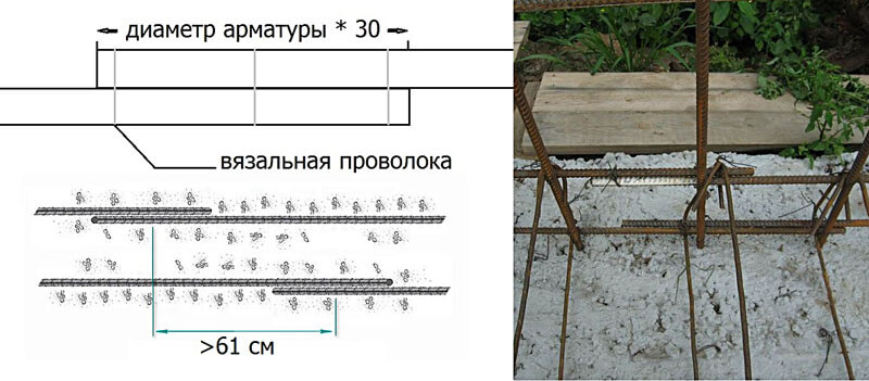 При расчете арматуры необходимо учитывать, что она обычно продается стержнями длиной от 3 до 6 метров. Не каждый поставщик металлопроката может предложить арматуру длиной от 0,5 до 11,7 метров. Часто на месте арматуру нужно резать по размеру и стыковать внахлест, как показано на схеме.