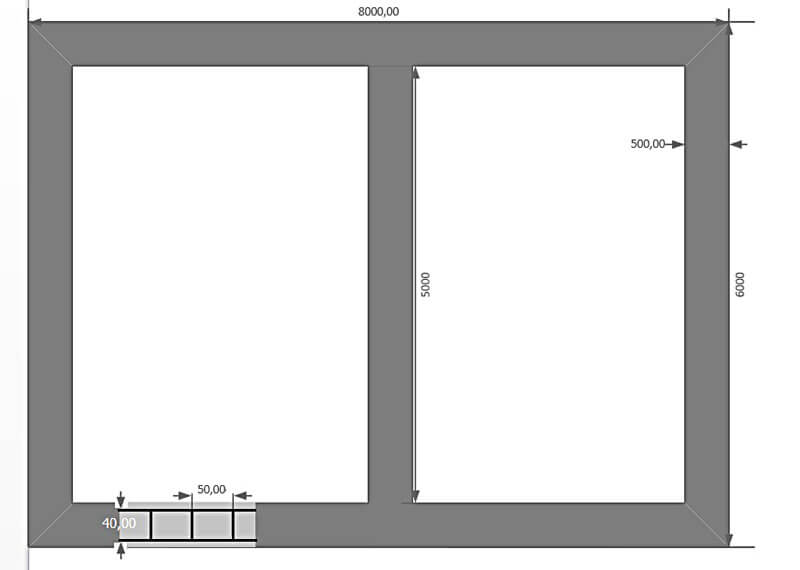 Для начала определим, сколько таких обрамляющих прямоугольников может поместиться на стене длиной 8 метров. Как видно из схемы, на восьмиметровой стене уже размещены 6 угловых элементов. Если учитывать, что перемычки должны располагаться через каждые полметра, то потребуется дополнительно разместить еще 12 таких соединений. То же самое справедливо и для второй восьмиметровой стены.
