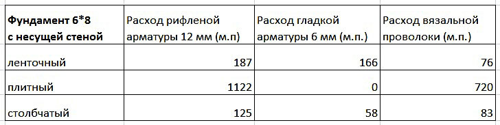 Для ленточного фундамента размером 6*8 с несущей стеной потребуется 166,43 кг рифленой арматуры диаметром 6 мм, 40 кг гладкой арматуры и 75,6 метров вязальной проволоки.