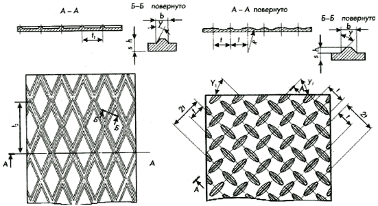 Формирование листов с ромбовидной текстурой проводится с применением диагоналей ромба размером (25-30)х(60-70) мм. Производитель определяет форму и размещение технологических углублений, а также ориентацию больших диагоналей ромба - совпадающую с габаритами листа или перпендикулярно им. Листы, рифление которых выполнено в чечевичном стиле, производятся с интервалом между рифлями 20, 25 и 30 мм.
