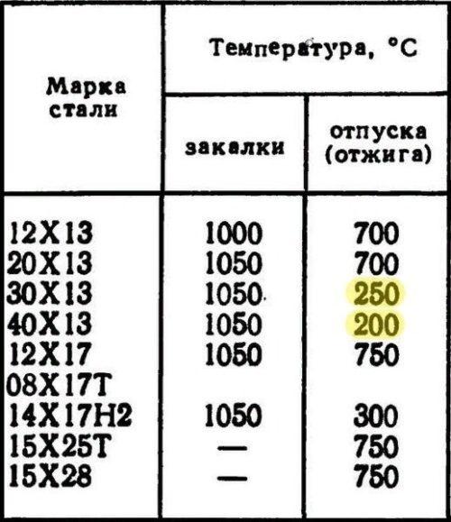 У продавца заготовок можно выяснить марку заводской нержавеющей стали, а также получить совет по её закалке. Если же материалом служит старая вещь, то в интернете можно найти таблицы изделий и марки стали, которые помогут определить исходный материал.