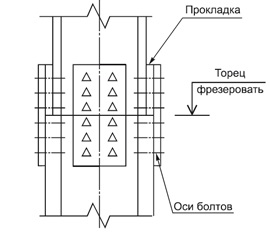 Данный метод используют для соединения балок вплотную. Сначала обрабатывают торцы балок фрезеровкой, чтобы они плотно прилегали друг к другу, и подготавливают четыре прямоугольные накладки для закрытия мест стыка на верхней и нижней полках, а также с обеих сторон стенки. Затем сверлят отверстия в накладках и балках в сборе. После этого вставляют болты и затягивают гайками. Вместо болтов можно применять заклепки, тогда соединение будет неразъемным.
