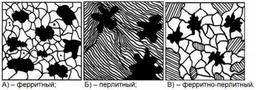 Ферритные изделия содержат феррит и хлопьевидный графит. Перлитные изделия состоят из перлита и хлопьевидного графита. Ферритно-перлитные изделия включают в себя феррит, перлит и хлопья графита.