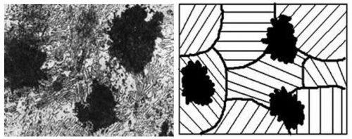 На изображении представлены различные типы графитовых включений. Они могут быть в форме пластин, шаров или иметь вид хлопьев.