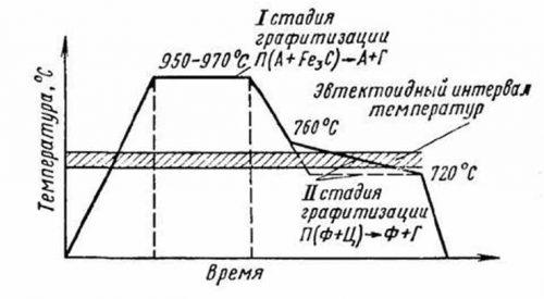 - На первом этапе заготовки нагреваются до 950–1000 °C и выдерживаются при этой температуре до завершения распада ледебурита (цементит + аустенит) на графит и аустенит.
