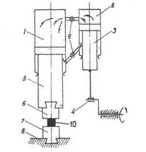 (1 — рабочий цилиндр, 2 — компрессорный цилиндр, 3 — поршень, 4 — кривошипный механизм, 5 — баба, 6 и 7 — верхний и нижний бойки, 8 — подушка, 9 — воздухораспределительный механизм, 10 — деформируемая заготовка)